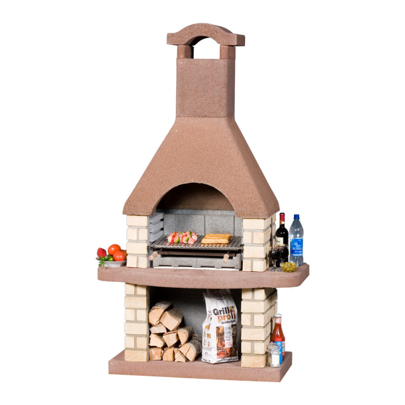 Dodáváme jako stavebnici s konečnou povrchovou úpravou, provedenou ručně osazenými mrazuvzdornými pásky z pálené hlíny. Střecha, základová a pracovní deska jsou probarveny do odstínu terakota. Sada ohniště pro zvýšenou odolnost proti přetopení je součástí dodávky a skládá se ze žáruvzdorné vložky, litinového roštu a jeho betonového držáku. Topení dřevem je možné.